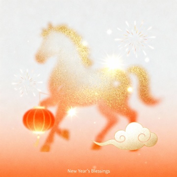 鎏金粒子勾勒奔马剪影,融合国潮插画风与朦胧梦幻感,红灯笼与祥云点缀,喜庆祥和,传递新春祝福。