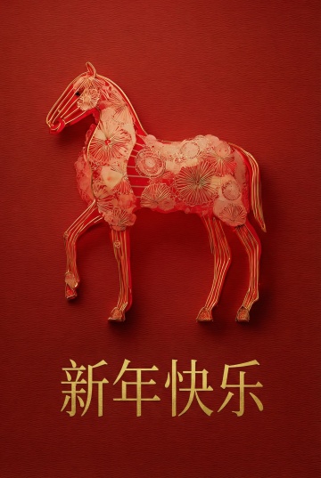 剪纸风与皮影风结合,白色骏马饰以鎏金花卉,红底映衬灯笼、烟花与祥云,尽显国潮中式喜庆。