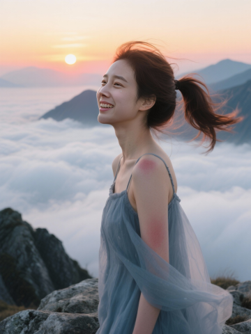 轻拟物风融合虚拟自然,胶片质感呈现晨曦云海间少女的温柔侧影,光影流动中透出梦幻与静谧的诗意。