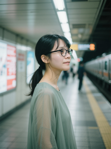 胶片风质感,东亚都市地铁站场景,柔和光影与清新色调交织,人物侧影静谧文艺,实景感十足,传递舒适悠然的日常诗意。
