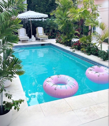 夏日泳池场景,高清晰度写实摄影风格,明亮阳光照射下的清澈蓝色池水,池壁由白色和深蓝色瓷砖铺砌,带有金属扶手的泳池阶梯部分浸入水中,水面波光粼粼并反射出耀眼的光斑,池边铺设浅棕色防滑地面,边缘点缀着色彩鲜艳的夏季花卉如粉色和黄色的绣球花,几只彩色充气游泳圈随意放置在池畔,远处可见白色遮阳伞和蓝白条纹的躺椅,营造出轻松愉快的夏日度假氛围,温暖的色调,清晰的光影对比,自然的阴影投射,整体画面充满夏日活力与清凉感。
