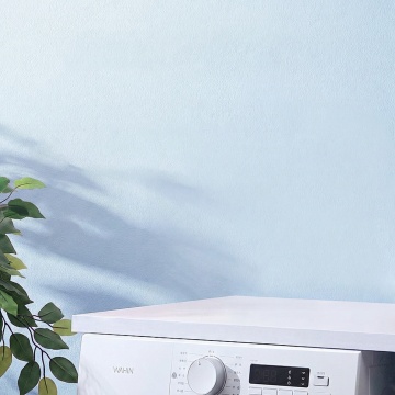 极简主义风格的白色双门冰箱位于画面中央,保持其原有形态与设计细节。冰箱周围环境改为温馨明亮的北欧风厨房一角,浅灰色木纹地板延伸至墙面,墙面采用柔和的米白色。冰箱右侧是原木色一字型橱柜,台面整洁,摆放着透明玻璃罐,内装杂粮与意面。橱柜上方悬挂着简约白色搁板,放置几只白色陶瓷碗碟。左侧靠近冰箱处有一盆大型龟背竹绿植,叶片舒展自然。画面左下角放置一把金色金属框架的餐椅,搭配浅灰色布艺坐垫。整体采用自然光线下的柔和光影,色调清新明快,营造出简约舒适的居家氛围,构图保持对称平衡,视觉焦点集中于冰箱主体,细节丰富且具有生活气息。