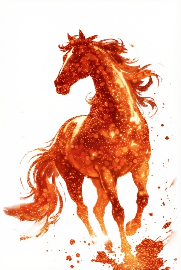未来感与科技感交织的3D虚拟骏马,以玻璃风与液态风呈现清透质感,红色半透明材质营造梦幻氛围,流动线条强化体积感,背景点缀数字光斑,尽显前卫美学。