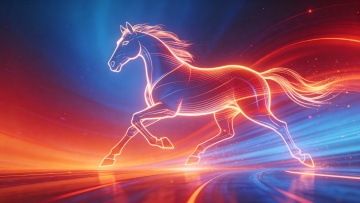 霓虹描边骏马奔腾,光影交织的虚拟自然中,未来感与科技感碰撞,粒子流动营造梦幻氛围,酷炫体积感尽显速度之美。