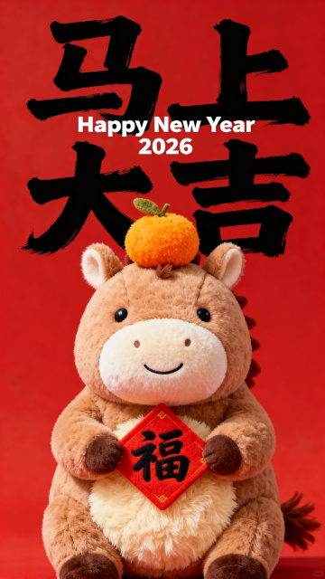 3D拟人马戴刺绣帽,红底金字“2026”,配流苏耳坠,国潮风喜庆迎新春。