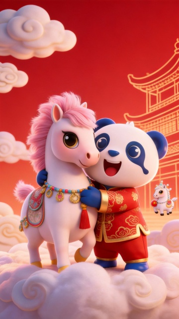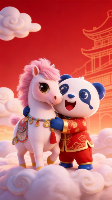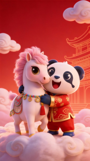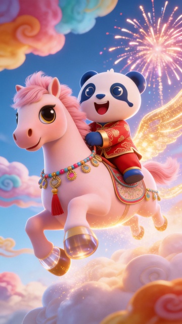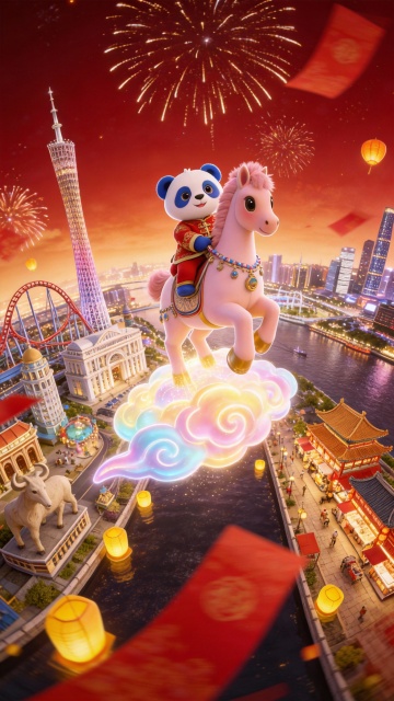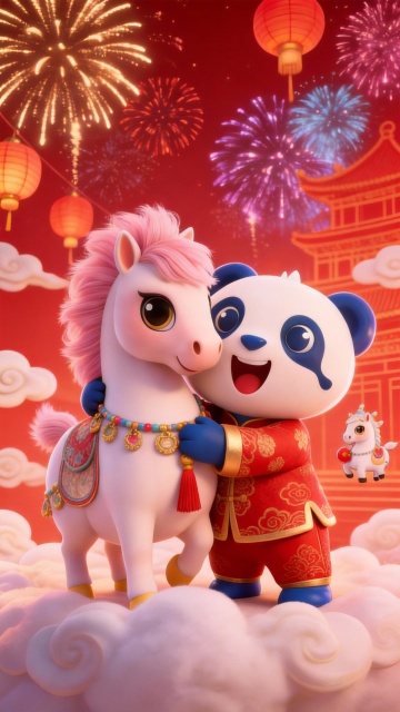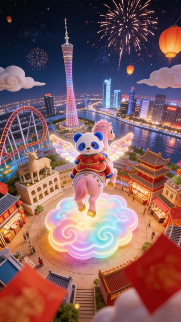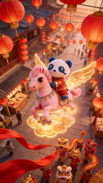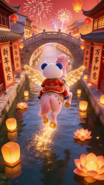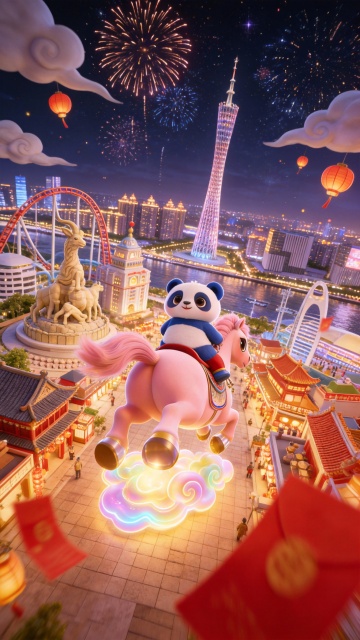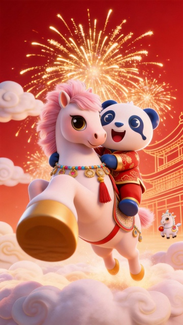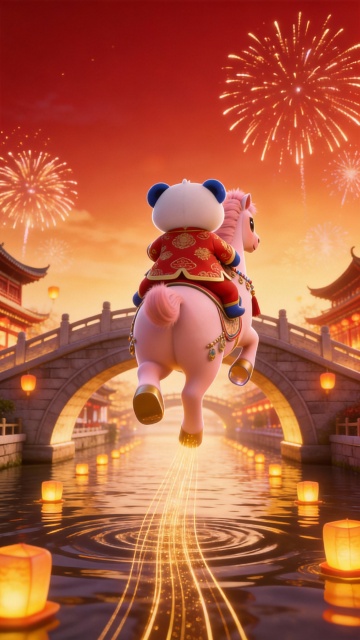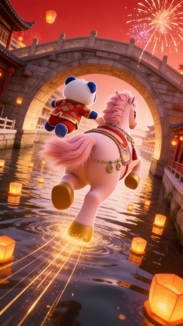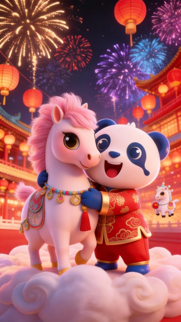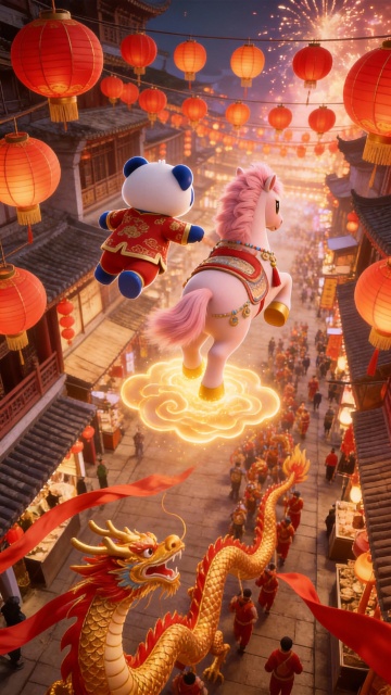 国潮风与软3D结合,卡通马灯悬于古建筑檐下,霓虹光影交织,烟花绽放,喜庆梦幻氛围浓郁。