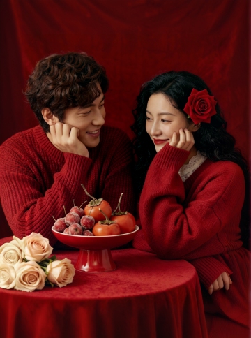 国潮风剪纸元素点缀,复古红金配色营造喜庆氛围,刺绣纹理毛衣呼应中式美学,温馨情侣依偎,尽显新年团圆暖意。
