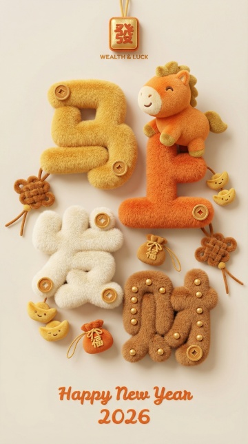 软3D毛绒质感结合国潮元素,卡通马与“马到发财”字样萌趣十足,喜庆温暖,传递2026新年好运。