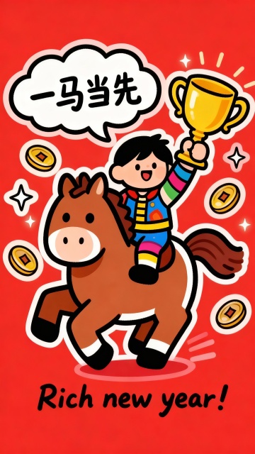 喜庆红底配卡通拟人马与男孩,描边插画风,剪纸感十足,金币环绕,手持奖杯,寓意一马当先,新年富贵吉祥。