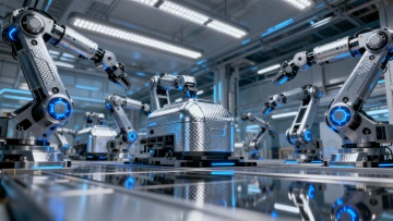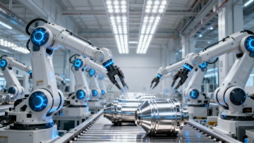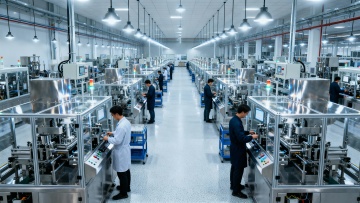 明亮的未来主义风格工厂内部,高科技自动化生产线整齐排列,精密数控机床与机械臂高效运作,身着白色工作服的技术人员在洁净的车间内巡查,柔和的白色与金属银灰色调为主,点缀蓝色科技光效,高天花板上矩阵式LED灯光提供均匀照明,地面光洁如镜反射设备轮廓,整体呈现出高度现代化、秩序井然且充满科技感的先进制造氛围,空间开阔,设备布局科学合理,传达出高效、精准、创新的工业美学。