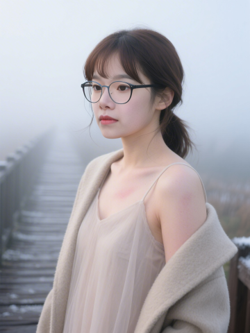 雾霭中的少女,胶片风肌理与柔和光影交织,朦胧清透中透出文艺优雅,实景感与唯美主义并存,静谧而清新。