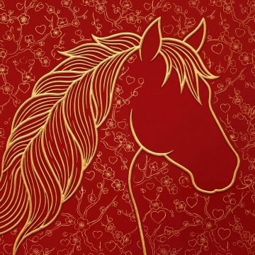 红金剪纸风马首剪影,融入梅花与心形图案,国潮中式喜庆设计,鎏金点缀,尽显民族韵味。