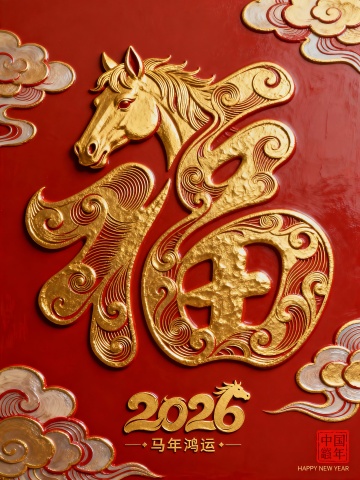 鎏金剪影马首与书法“福”字融合,国潮风韵十足,红金配色尽显喜庆中式感,大字风设计彰显2026马年鸿运。