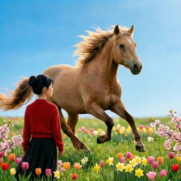 明亮通透的阳光明媚春日花园场景,湛蓝天空点缀着轻盈白云,温暖阳光从右侧斜射,形成清晰柔和的光影层次与长长的投影。画面中央是一条由圆形石板铺成的小径,蜿蜒穿过修剪整齐的翠绿草坪,通向一棵枝繁叶茂的大树,树上开满黄紫色绣球花与白色小花,树枝上吊挂着一个木质秋千椅。小径两侧及整个花园中遍布五彩斑斓的花卉,包括粉色玫瑰、白色雏菊、紫色薰衣草、黄色郁金香和红色杜鹃花等,花丛茂密繁盛,色彩饱和明快,形成自然和谐的色彩渐变。远景可见绿色灌木丛和模糊的蓝色海景轮廓,整体构图采用三分法,花园元素错落有致,营造出宁静、浪漫、生机勃勃的氛围,细节丰富,质感细腻,光影效果极佳,呈现出梦幻般的田园风光。