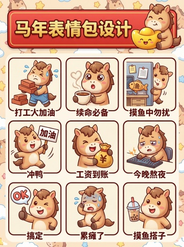 卡通拟人马形象,扁平插画风,融合emoji趣味表达,清新可爱,传递马年节日氛围与日常情绪共鸣。