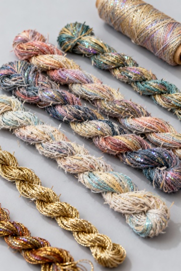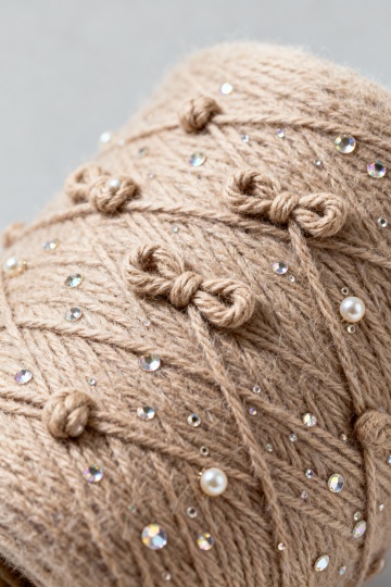 手工编织圣诞树,拼贴风与重拟物结合,色彩缤纷的绳线、纽扣与布片营造喜庆温馨氛围,3D混合材质展现极繁主义趣味感。