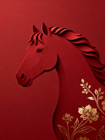 国潮风剪纸与鎏金浮雕结合,马首造型灵动,红金配色尽显喜庆与中式韵味,祥云点缀,传递2026马年鸿运祝福。