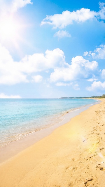 明亮阳光下的沙滩特写,前景是细腻柔软的浅米色沙子,散落着一只橙色海星、几个彩色贝壳和一顶宽边草帽,远处是虚化的绿色棕榈树和蔚蓝天空,营造出宁静悠闲的夏日氛围,光影柔和温暖,整体呈现写实风格,色调明快清新,构图采用近实远虚的层次感设计。