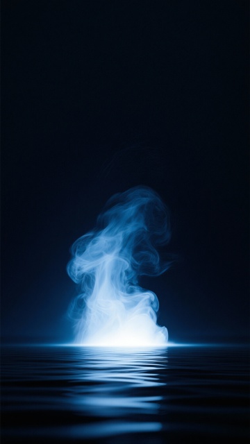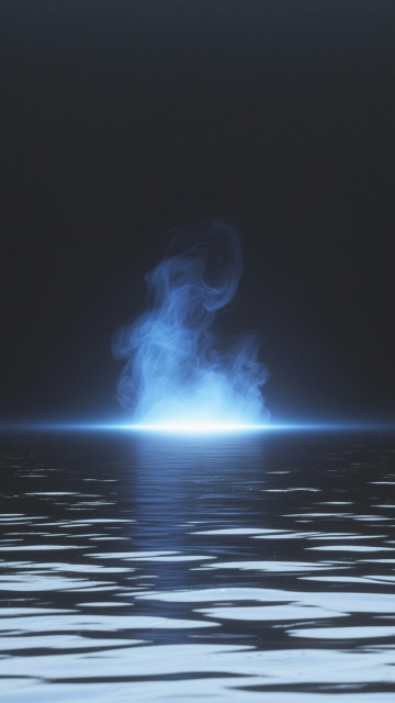 深邃神秘的深色背景下,一片广阔而平静的深色水面占据画面下方,水面泛着细腻的波纹与微妙的反光,呈现出光滑湿润的质感。画面中央至下方区域,一团散发着柔和蓝白色光芒的烟雾或雾气缓缓升腾、弥漫开来,烟雾边缘朦胧虚化,内部光影层次丰富,呈现出流动的、缥缈的形态。光源集中在烟雾底部与水面相接处,形成一道明亮的光带,向上逐渐过渡为深邃的暗色调,整体营造出宁静、幽远、略带神秘感的氛围,光影对比柔和,色彩以深蓝、靛蓝、墨黑为基调,点缀明亮的蓝白色光效,具有极高的视觉冲击力和艺术感。
