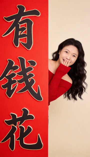 国潮风剪纸质感,鎏金书法“喜迎新春”跃然其上,光影交错间透出中式喜庆,红衣女子手持“福”字,温暖笑容传递新春祝福。