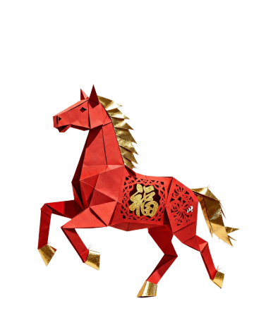 低多边形剪纸风骏马,红金配色,镂空“福”字,融合中式喜庆与几何美感,鎏金细节尽显节日华韵。