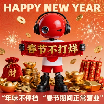软3D风卡通机器人持“春节不打烊”横幅,融合国潮元素与鎏金质感,喜庆感十足,科技感与传统年味交织,烟花金币环绕,传递节日祝福与营业信息。