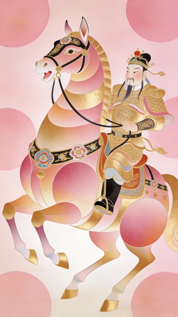 这幅作品以 “马上发财” 的吉祥寓意为核心,融合马年生肖与传统财神元素。粉橙渐变的柔和色调消解了传统财神的威严感,几何块面重构的造型保留了纹样华贵细节,又以现代扁平风赋予视觉新鲜感,传递出兼具文化底蕴与潮流审美的新年祝福。