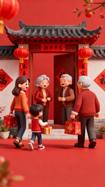 软3D风格插画,融合国潮元素与卡通感,雪夜烟花绽放,红灯笼高挂,孩童嬉戏屋檐,温馨喜庆的春节氛围扑面而来。