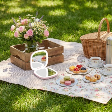 阳光明媚的花园露台餐厅,原木色方形餐桌搭配藤编靠背餐椅,桌面上摆放着白色陶瓷餐具和插满粉色玫瑰的玻璃花瓶,四周被茂密的绿植和盛开的花卉环绕,顶部悬挂着造型简约的白色布艺吊灯,地面铺设浅色防滑地砖,远处可见木质围栏和蓝天白云,整体呈现出清新自然、温馨舒适的田园风格,光线明亮柔和,营造出轻松愉悦的用餐氛围。