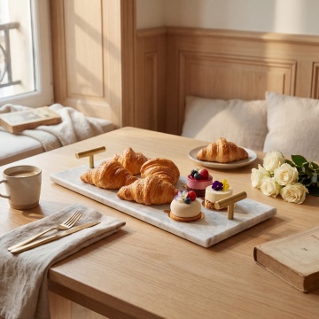 俯视角构图,清晨的北欧风格厨房转角处,阳光透过百叶窗在原木色中岛台表面投下精密的光栅图案,白色哑光橱柜与浅灰色水磨石墙面形成优雅过渡,台面上并排放置着藤编餐篮(内置新鲜法棍与彩色餐巾)、铜制量杯组、半切的牛油果与散落的蓝莓,壁挂式黄铜轨道灯垂下三盏磨砂玻璃罩吊灯,下方是悬挂的手工陶瓷餐盘与榉木砧板,窗台摆放着垂吊的佛珠吊兰与复古搪瓷水壶,整体色调为奶油白、燕麦色与原木棕的温柔交响,光线带有晨雾般的朦胧质感,细节处可见木质纹理与陶瓷冰裂纹理的自然肌理。