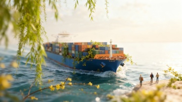 一艘大型集装箱货轮的平面矢量图标,船体和集装箱呈现出从深绿色到浅绿色的渐变效果,船头下方有波浪线条装饰,整体设计简洁现代,轮廓清晰,白色背景,风格为简约的商业标识设计。