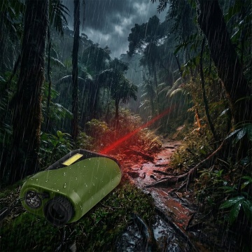 背景是夜晚森林中的地上,一支黑色战术手电筒的特写,一半的体积被雨水浸泡在水中(从地面泼溅而起,激起水花,水花晶莹剔透,折射着光线),背景是森林。