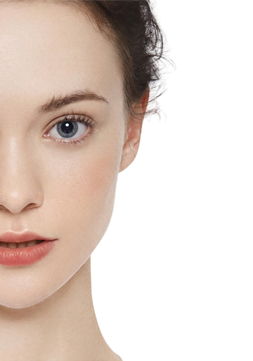 侧脸向上扬起的女性,双眼轻闭,深棕色头发优雅挽成低发髻,面部覆盖着由发光线条构成的网格,网格节点处有闪烁的白色光点,肌肤呈现出极致细腻、光滑、通透的质感,整体画面采用纯净的白色背景,光线柔和均匀地洒在人物轮廓上,营造出科技感与自然美的完美融合,突出皮肤的健康光泽与精致纹理,氛围宁静、高端且富有未来感。