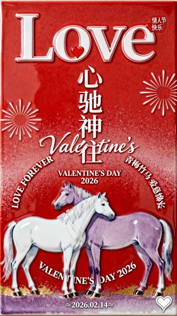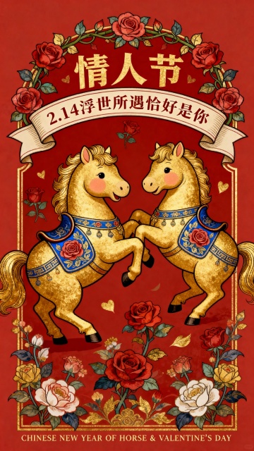 国潮插画风,拟人化双马相依,鎏金剪纸元素点缀桃花,喜庆甜蜜中透出可爱,呼应马年与情人节主题。