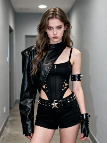 一个高级感欧美模特单膝跪姿,穿着图片上的穿搭,张扬时尚的姿势,纯色背景,(不同于图片片上模特的长相和姿势)