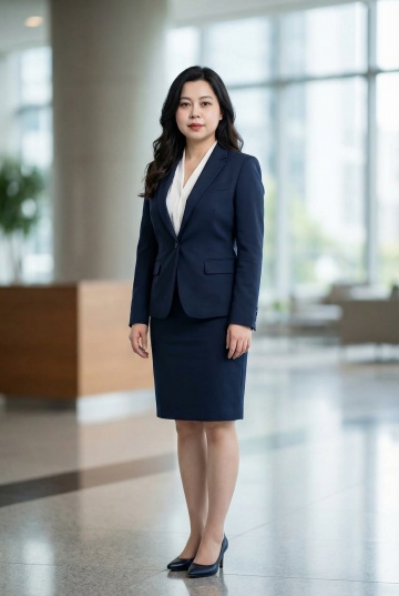 参考第一张图保留人物脸型、年龄等特征生成职场形象照,参考第二张图人物占位和比例,标准焦段50mm,F/4光圈(F/2.8-F/4区间),平视视角(镜头与人物视线齐平);人物占画面70%,人物居中(居中构图),位于画面中心,为视觉聚焦点,入境范围头部及以下至臀部下方10cm(半身像);左右留少量背景空间;头部与画面顶部保留5%空间;头部发型完整;肤质白皙细腻,头肩比例协调,美颜磨皮韩式精致自然的浓妆