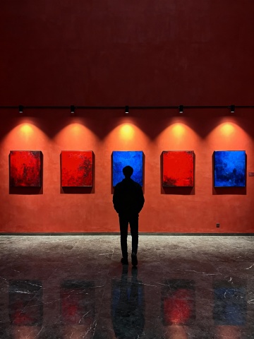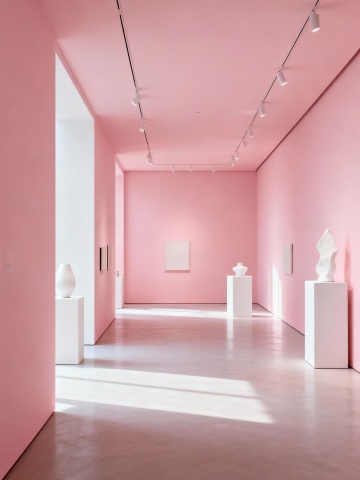 实景感与油画风交融,现代美术馆中光影交织,文艺气息弥漫,人物与画作形成镜像对话,展现当代艺术的深邃意境。