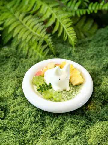 清新自然风,可爱卡通小兔造型甜品,软3D质感搭配毛发生长般绿意背景,微缩艺术呈现春日生机。