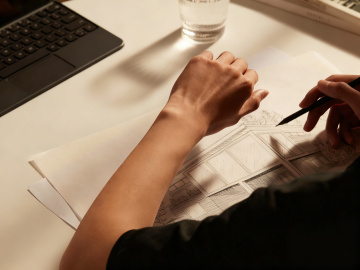 一个正在写字/整理文件的人,桌子上有笔记本、文件夹,传达“梳理信息、准备素材”。