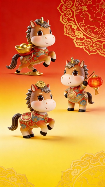 2026新年春节马年生肖卡通IP形象元素,拟人化的可爱小马,融合国潮与鎏金元素,喜庆红金配色搭配浮雕纹样,设计 "福马"(驮元宝)、"喜马"(举灯笼)、"财马"(戴铜钱) 等多种变体,适用于新年海报、红包、文创周边等场景。