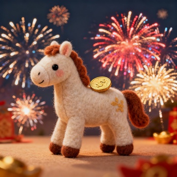 软3D风毛绒小马,萌趣可爱,背负金币,烟花绽放,喜庆新春氛围浓厚。
