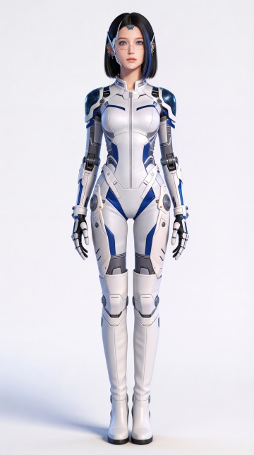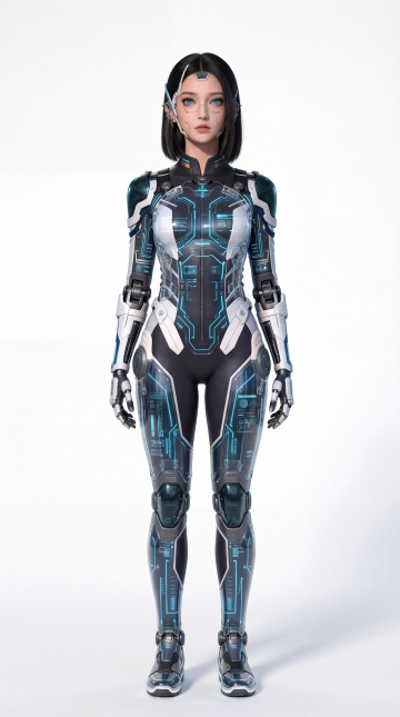赛博朋克风机械女性,融合未来感与科技感,金属机身搭配霓虹灯背景,3D重拟物设计展现机能美学。