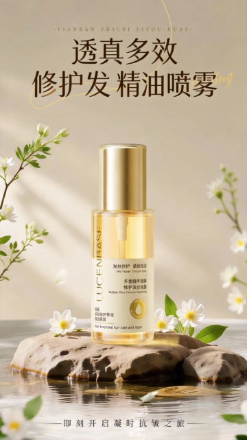 高清摄影风格的洗发水产品海报,柔和的米黄色背景营造出温馨自然的氛围,中央放置一瓶透明瓶身、黑色按压泵头的洗发水,瓶内是淡黄色液体,瓶身印有简洁的品牌文字,置于天然质感的浅棕色岩石上,岩石旁点缀一朵白色盛开的鲜花和几片绿色叶子,背景中两侧摆放着带有绿色植物的陶土花盆,光线从左上方柔和照射,形成细腻的阴影和高光,整体色调统一为温暖的米色、棕色和绿色,构图采用对称与平衡的布局,突出产品的自然纯净感,传达出沐浴在自然花香中的舒适体验。