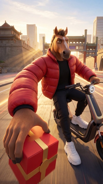 国潮风3D拟人马骑电驴送礼,现代都市与中式古建交织,光影流动,喜庆红金配色,虚拟现实感十足。