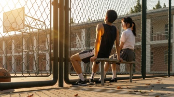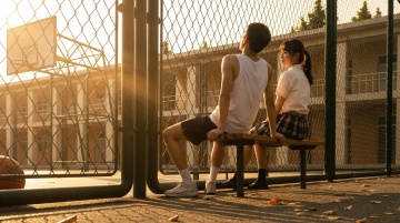 胶片风写实场景,自然光效下的篮球场黄昏,人物姿态柔和清新,都市青春气息浓郁,文艺与时尚交织。