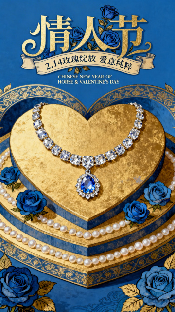 国潮插画风,拟人化双马相依,鎏金剪纸元素点缀桃花,喜庆甜蜜中透出可爱,呼应马年与情人节主题。