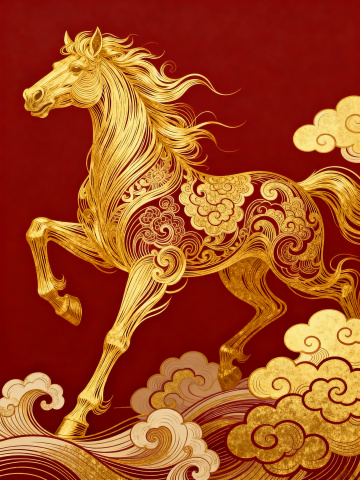 鎏金骏马踏祥云,国潮风韵尽显中式奢华,描边工笔勾勒古典优雅,喜庆祥瑞迎新春。