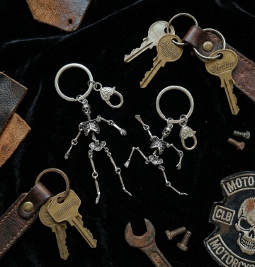 超高精度摄影风格,白色纯色背景,四把不同样式的金属钥匙通过银色钥匙圈整齐排列,每把钥匙均展现出真实的不锈钢金属质感,包括清晰的拉丝纹理、边缘锐利的齿牙结构、钥匙柄上独特的雕花图案和凹槽设计,光线从左上方45度角照射,形成自然的高光反射和柔和阴影,整体构图居中对称,钥匙间保持均匀间距,呈现出干净利落的产品展示效果,细节丰富,金属光泽细腻,无任何文字或装饰元素干扰主体。