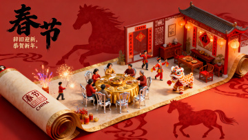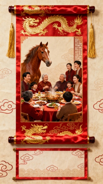 国潮风卷轴设计,融合刺绣与鎏金元素,浮雕质感马纹点缀,红金配色尽显喜庆中式复古氛围,团圆宴场景传递节日温情。