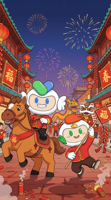 软3D风格插画,融合国潮元素与卡通感,雪夜烟花绽放,红灯笼高挂,孩童嬉戏屋檐,温馨喜庆的春节氛围扑面而来。